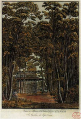 "Ein finsterer Gang, den der Gesang der Vögel lebendig macht, führt zu einem finstern schattenreichen Platz, auf welchem ein Badehaus steht, mit der Aufschrift: Mari marharbe. Das geräumige Badehaus ist von außen ländlich mit Birkenborke bekleidet. Ein doppeltes Dach giebt demselben den Vorzug der Neuheit, und das helle Wasser dieses Bades ist anlockend und kühlend."8 Über der Tür des Gebäudes sind die Worte "MARI EWHARRE" erkennbar. Unterhalb der Abbildung ist zu lesen, man sehe “Bad und Haus wie auf Otahita nach Cook”. Eine architektonische Vorlage für das Garzauer Badehaus bot ein Stich u.d.T. Ansicht der Insel Huahine; mit dem Ewharra no Eatua oder Totenhaus... in Hawkesworth's dreibändiger Geschichte der Seereisen und Entdeckungen im Südmeer... (Berlin 1774)9.